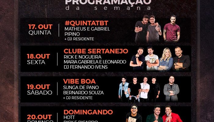 No dia 17 de outubro, quinta-feira, na #QUINTATBT, será a vez da dupla sertaneja Matheus & Gabriel animar o público com seus grandes sucessos. Mas além deles, o cantor Pipino e o DJ da casa prometem não deixar ninguém parado. Já no dia 18 de outubro, sexta-feira, a Rust Music Bar receberá, no CLUBE SERTANEJO, a dupla Rick & Nogueira, Maria Gabriela e Leonardo e o DJ Fernando Ivens. Já no dia 19 de outubro, sábado, o bar traz, na VIBE BOA, o grupo Sunga de Pano, o cantor Bernardo Souza e DJ. Para fechar a semana com chave de ouro, no dia 20 de outubro, domingo, o DOMINGANDO chega com o cantor Hott, Rick & Ricardo e DJ Siman.